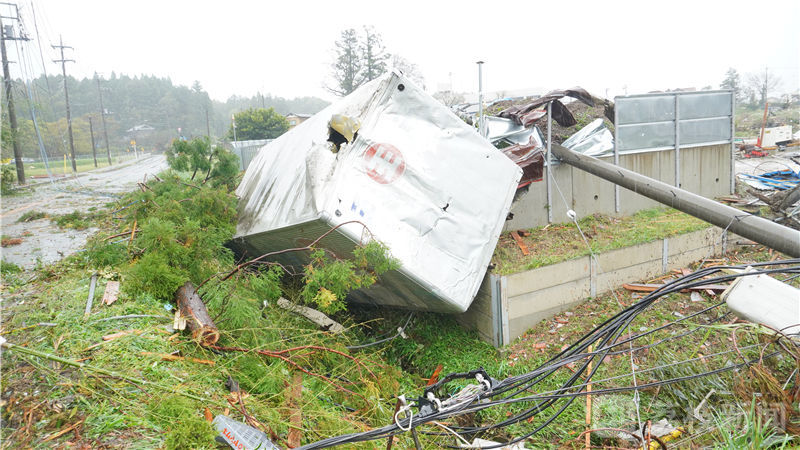 在现场记者看到住宅区的数栋民房屋顶被吹飞,在一个长一百米宽五十米的范围内多数房屋的外墙、窗瓦都损坏了。道路上很多汽车也被刮倒的树木砸坏,一些电线杆也倒了。据了解,目前已经有一人死亡,死者是在一个被风推倒的卡车里发现的。目前已知有包括儿童在内的五个人受伤。