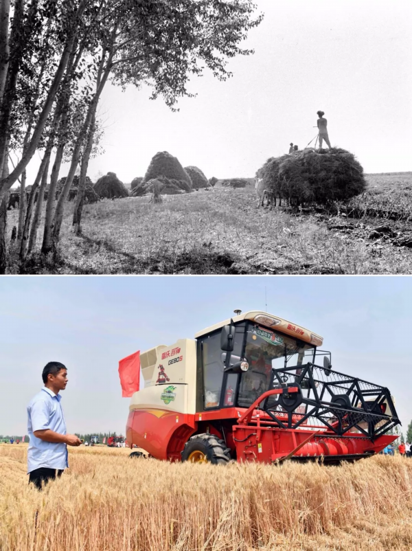 上图为1949年10月8日,黑龙江讷河农民在秋收(新华社记者 王纯德/摄);下图为2019年5月31日,在山东省济宁市嘉祥县仲山镇,雷沃重工股份有限公司工作人员在遥控指挥自动驾驶收割机作业(新华社记者 郭绪雷/摄)。