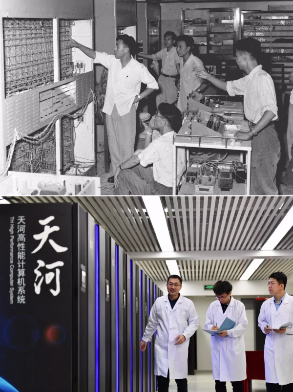 上图为1958年,中国科学院计算技术研究所和有关单位在苏联的技术援助下试制成功我国第一台通用电子计算机——“八一”型电子计算机。这是工作人员在观察运行工作中的通用电子计算机(新华社记者 李基禄/摄);下图为2019年4月24日,在国家超级计算天津中心“天河三号”原型机机房内,国家超级计算天津中心应用研发部部长孟祥飞(左)和同事一起巡查(新华社记者 李然/摄)。