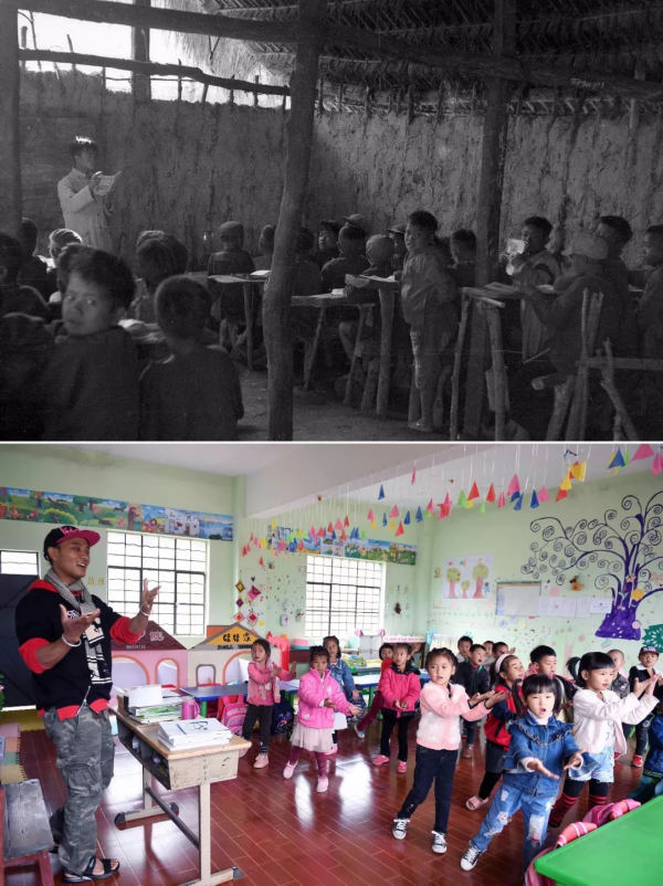 上图为1954年,在云南省普洱市西盟佤族自治县创办的第一所小学——西盟小学,老师带领孩子读书学习(资料照片);下图为2018年12月7日,云南省普洱市西盟佤族自治县勐梭镇班母村佤山育忠幼儿园的孩子跟着老师上音乐课(新华社记者 杨宗友/摄)。