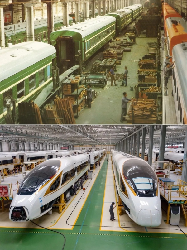 上图为上世纪90年代的长春客车厂载客列车装配生产线(资料照片);下图为2019年6月20日,中车长春轨道客车股份有限公司(中车长客)工人唐建坤(前)在中车长客高速动车组制造中心检查“复兴号”动车组列车底部电气系统(新华社记者 张楠/摄)。