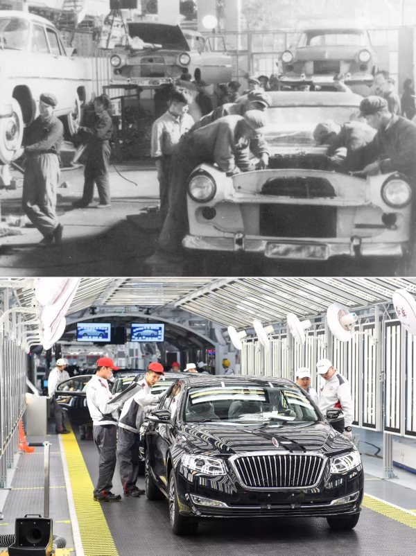 上图为1958年拍摄的第一汽车制造厂,这里生产了第一批红旗轿车(资料照片);下图为2019年4月9日,在一汽红旗总装车间内,职工在对生产的红旗轿车进行静检作业(新华社记者 许畅/摄)。