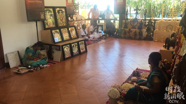 △在宴会厅的门厅里,陈列着特色工艺品。两国领导人在这里欣赏了民间工艺制作、表演。(央视记者李辉拍摄)