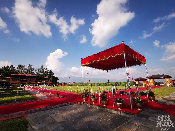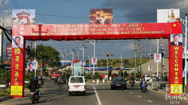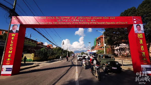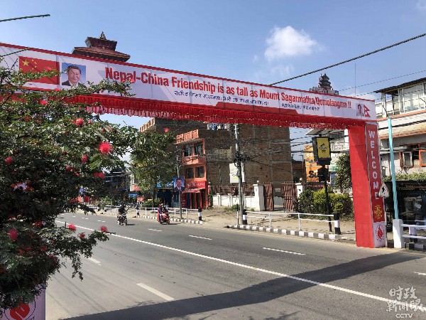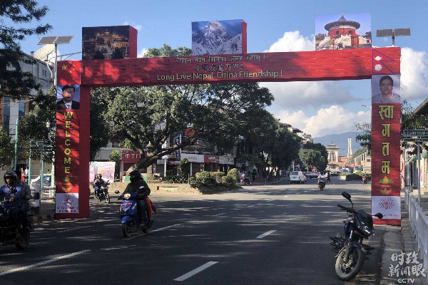 △“伟大的中尼友谊源远流长、牢不可破”拱门。(央视记者张晓鹏拍摄)
