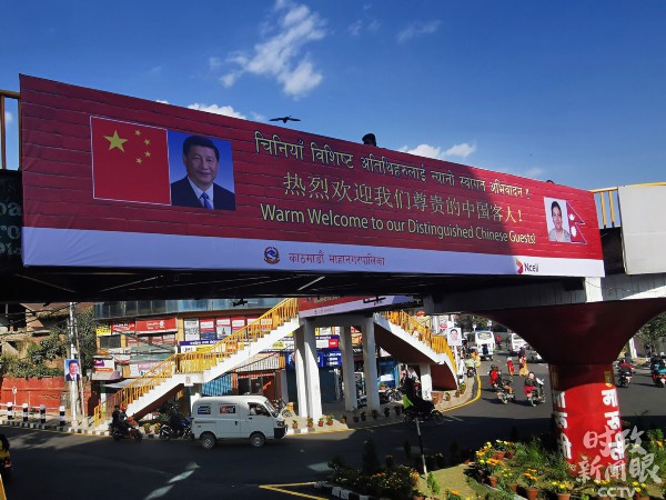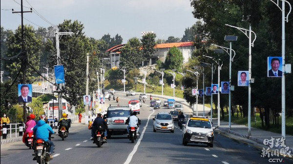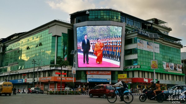 △加德满都市中心的大屏幕上,循环播放着今年4月习近平举行仪式欢迎班达里总统访华的视频。(央视记者张晓鹏拍摄)