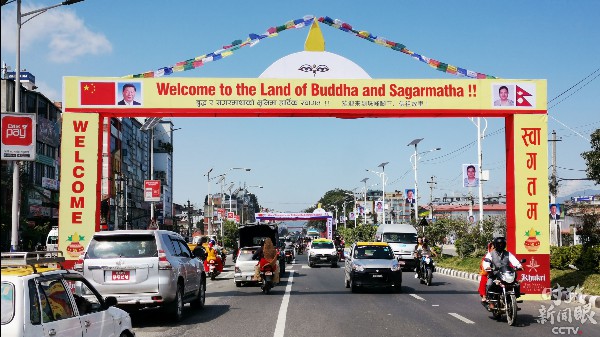 △“欢迎来到珠峰脚下、佛祖故里”拱门。上方装饰着加德满都的标志性建筑——布达纳特佛塔。(央视记者张晓鹏拍摄)