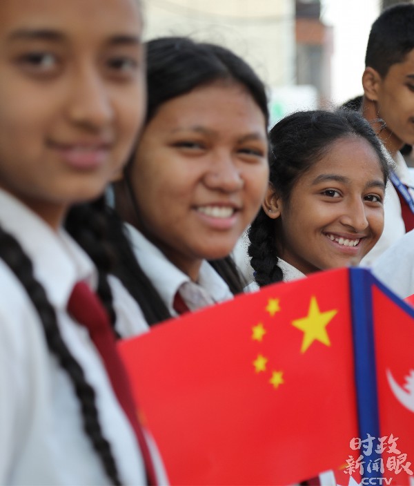 △手持中尼两国国旗的青少年。(央视记者贾建京拍摄)