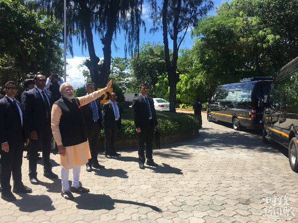 当天上午,习近平主席从下榻酒店乘车抵达泰姬酒店,莫迪总理在下车处迎接。