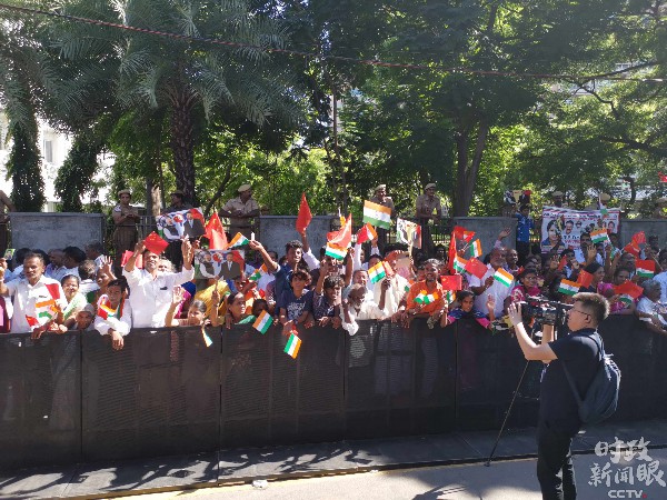 △在金奈,习近平主席受到当地群众的热情迎接和欢送。这是下榻酒店附近手持中印两国国旗的人群。(央视记者张宇)