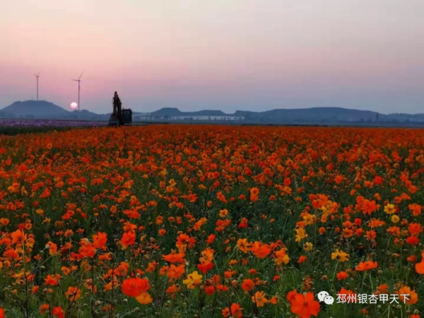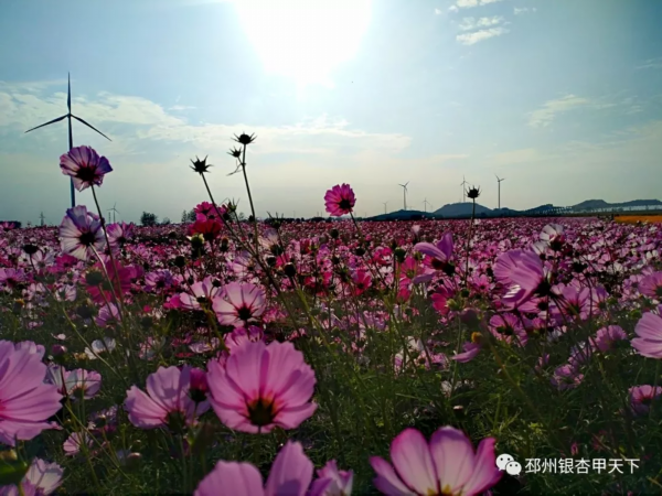 千亩花海在蓝天白云下竞相绽放,波斯菊、百日草、硫化菊等橙黄、幽紫、嫩粉、绚蓝.....还有远远近近的大风车,远远望去,蔚为壮观,美仑美奂,令人赏心悦目!