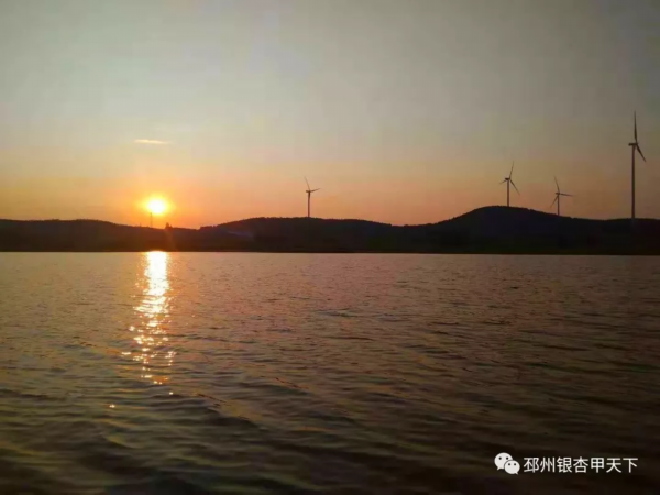 在黄楼水库边,游客三五成群,悠闲地沿着堤岸漫步,感受着湖风的吹拂。远处山峦绵缓,风车回旋,阳光倾洒在水面之上,波光荡漾,美不胜收。