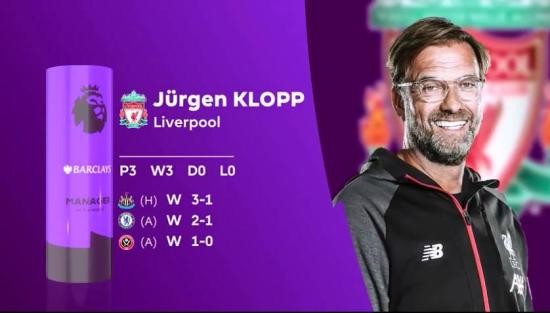 9月份,克洛普率队取得英超3战全胜。图片来源:英超官方