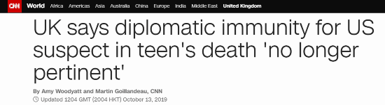 8月,一名美国外交官妻子在英国逆行撞死当地19岁少年后,利用其外交豁免权逃回美国。据美国有线电视新闻网(CNN)13日报道称,英国外交大臣13日表示,这个名为安妮·萨库拉斯的外交官妻子享有的外交豁免权已“不再适用”。