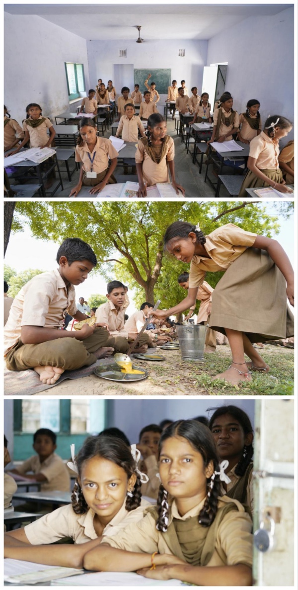 从阿格拉驱车前往“粉红之城”斋浦尔的路上,我们有幸走近农村Jhinjha,并和当地中学的孩子聊了会儿天。这里有从幼儿班到8年纪的260多名学生。从高速路下来行至乡村的公路崎岖不平,而校长Jaideo Rathore先生早早地站在校门口前大树下准备好迎接邻国客人。