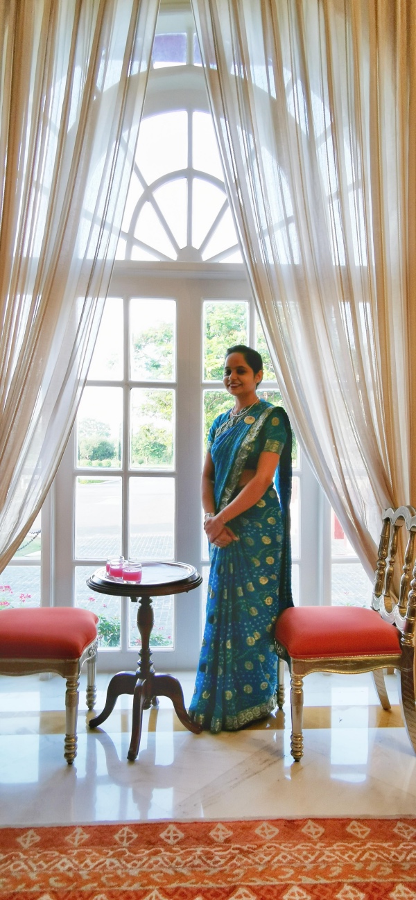印度人熟稔地将其一部分裹住腰部,折出8-10个褶皱作为装饰,再将上端塞入裙腰间固定,余下的部分经由前胸,披向左边肩膀后缓缓垂下。