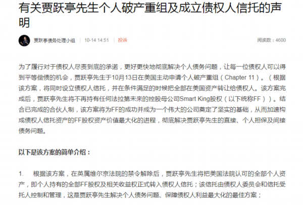 为了履行对于债权人尽责到底的承诺,更好更快地彻底解决个人债务问题,让每一位债权人可以得到平等偿债的机会,贾跃亭先生于10月13日在美国主动申请个人破产重组(Chapter 11)。(根据该方案,将同时设立债权人信托,并在条件满足的时候把全部在美国资产转让给债权人。该方案完成后,贾跃亭先生将不再持有任何法拉第未来的控股母公司Smart King股权(以下统称FF))。结合已完成的合伙人制,该方案将为FF的成功并成为一个伟大的公司奠定了坚实的基础,从而加速构成债权人信托资产的FF股权资产价值最大化的进程,彻底解决贾跃亭先生的直接、个人担保及间接债务问题。