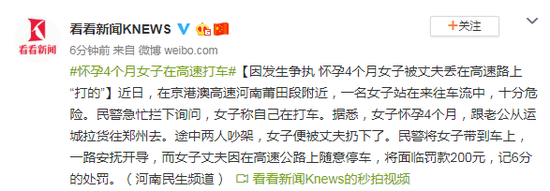 近日,在京港澳高速河南莆田段附近,一名女子站在来往车流中,十分危险。民警急忙拦下询问,女子称自己在打车。据悉,女子怀孕4个月,跟老公从运城拉货往郑州去。途中两人吵架,女子便被丈夫扔下了。民警将女子带到车上,一路安抚开导,而女子丈夫因在高速公路上随意停车,将面临罚款200元,记6分的处罚。(河南民生频道)