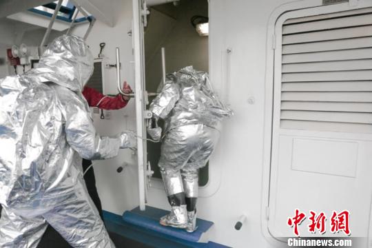 舵机舱发生火灾,探火队员穿着探火服,前往火灾地点探明火情。 亓创 摄