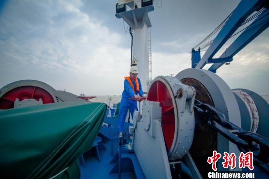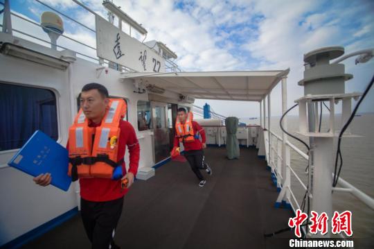 警报声响起,弃船求生演练开始。率先跑出的两名船员中一人手拿航海日志,一人手拿国旗。 亓创 摄