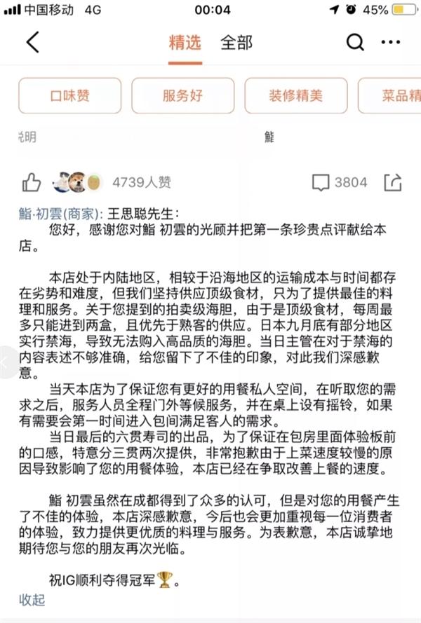 对于王思聪的1星评价,该店在点评中回复称:“当日主管对于禁海的内容表述不够准确,给您留下了不佳的印象,对此我们深感歉意。”