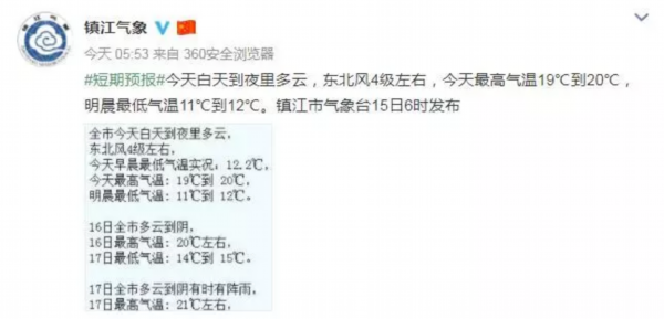 比如,16日镇江的最高气温为19℃,最低气温为12℃。大家可以试试“外套+衬衫”的穿法,清晨出门裹上外套,尽量捂着点;中午气温升高,如果在室外活动,可以只穿衬衫。