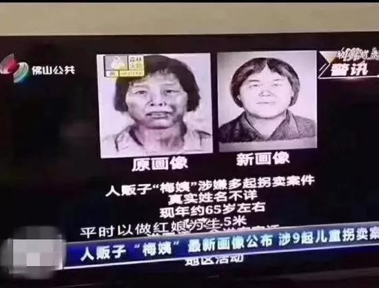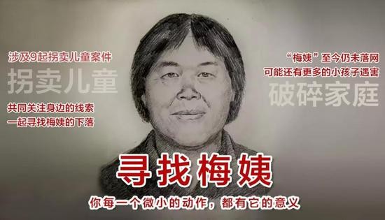 2017年6月,广州增城警方发布了一则通告,对一名叫“梅姨”的女子征集线索。通告称,“梅姨”,真实姓名不详,现约65岁,身高1.5米,讲粤语,会客家话,曾长期在增城、韶关新丰等地区活动,涉嫌多起儿童拐卖案件。警方在发布的征集线索通告中,还贴出了一张“梅姨”的模拟画像。