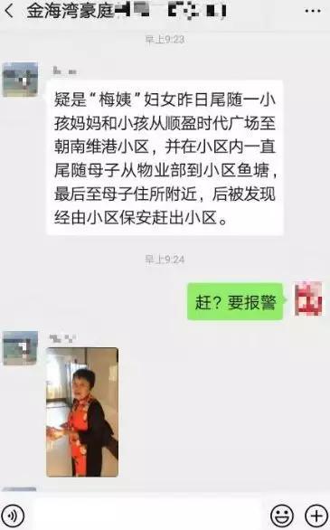 截图显示,有业主反映有一个妇女从清城区顺盈时代广场一直跟着他妻子和小孩回到了家门口,后来回家关门2分钟后,他再打开门发现该妇女还站在门口。流传的信息还附带了该妇女的照片:留着一头短发,年约60岁,身穿红黑色的旗袍。