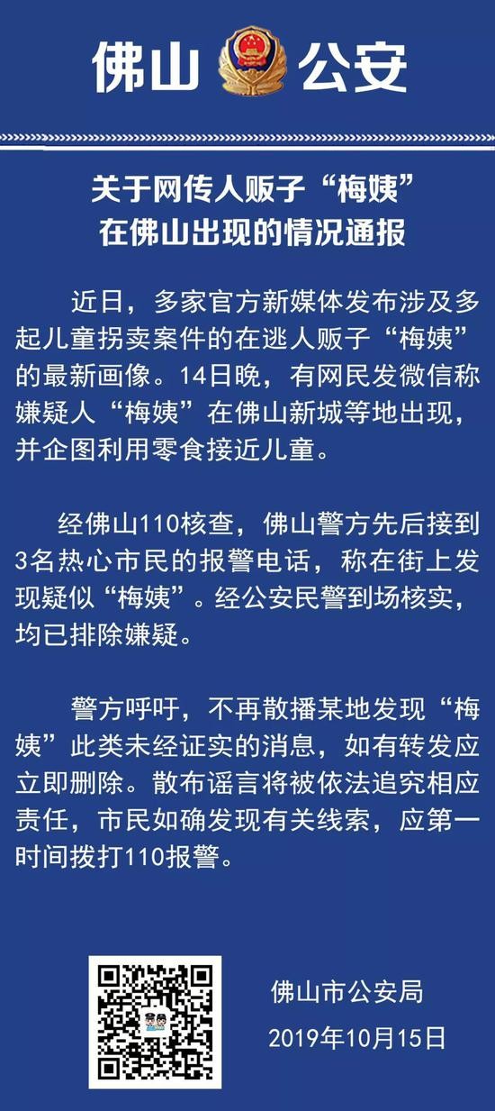 昨日下午,佛山公安发布了《关于网传人贩子“梅姨”在佛山出现的情况通报》,对近日有网民发微信称嫌疑人“梅姨”在佛山新城等地岀现的情况作出了说明。