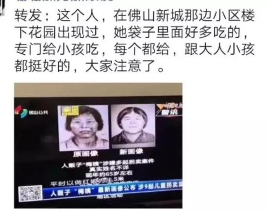 通报称,近日,多家官方新媒体发布涉及多起儿童拐卖案件的在逃人贩子“梅姨”的最新画像。14日晚,有网民发微信称嫌疑人“梅姨”在佛山新城等地岀现,并企图利用零食接近儿童。
