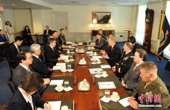 资料图:当地时间2019年4月1日,美国国防部代理部长沙纳汉与韩国国防部长官郑景斗在五角大楼举行会晤。中新社记者 陈孟统 摄