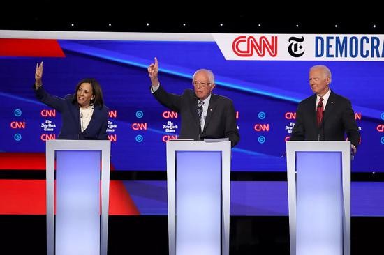 卡马拉·哈里斯、伯尼·桑德斯、乔·拜登参加辩论。