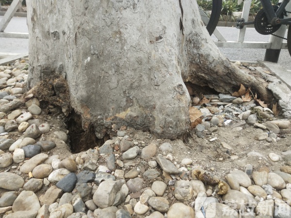 南京市中心的中山东路上一棵直径70公分的行道树,根部却被虫蛀了深约10公分的大洞。这棵树会不会有倒塌的风险?相关绿化园林部门将如何进行防治措施?近日,有网友反映,在南京市秦淮区大行宫中国人寿广场附近,有一棵直径大约70公分梧桐树的树根处出现了大的空洞,目测树叶也有枯死的趋势,万一被大风吹倒十分危险。