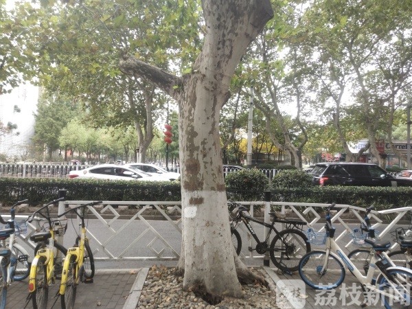记者发现,网友提到的这棵行道树位于秦淮区中山东路南侧,靠近南京市图书馆和大行宫东公交站,来往的人流量较大。走近这棵梧桐树,树梢的枝叶已经被全部砍掉,只留下了光秃秃的树干;树底有一个深约10公分的树洞,根部也有被虫蛀的迹象,而邻近的几棵行道树却没有这种情况。