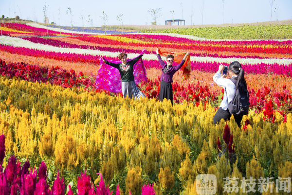 金秋十月,江苏省句容市占地近千亩的伏热花海处处姹紫嫣红,吸引着各地游客前来观赏。景区内根据不同地形、不同鲜花品种、不同种植形状形成了七彩花田、滨湖花田、星空花海等七大特色花田,绽放的粉黛、千日红、向日葵、硫磺菊等诸多花卉争奇斗艳,呈现出一幅幅“人在花中游,花在人边俏”的景致。