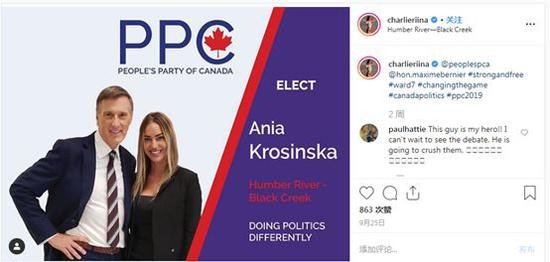 她所代表的加拿大人民党是由国会议员和现任总理特鲁多的竞争对手Maxime Bernier于2018年9月才成立的,但是,10月21日大选前夕的最新民意测验,目前已经获得3.1%的选票。