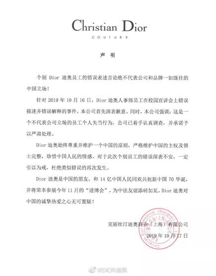 17日凌晨,迪奥官方微博发布声明称,针对2019年10月16日,Dior迪奥人事部员工在校园宣讲会上错误描述并错误解释的事件,公司深表歉意。迪奥称,个别Dior迪奥员工的错误表述言论绝不代表公司和品牌一如既往的中国立场。同时,公司已着手认真调查,并承诺予以严肃处理。