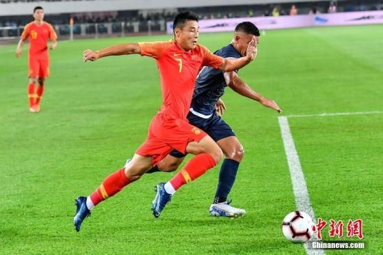 10月10日晚,中国队球员武磊在比赛中带球突破关岛队防守球员。当晚,中国队坐镇广州天河体育中心迎战2022年卡塔尔世界杯预选赛的第2个对手关岛队。最终,中国队7比0战胜关岛队。中新社记者 陈骥旻 摄