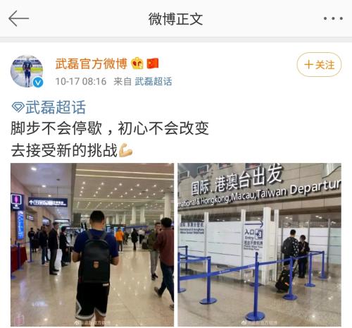 中新网10月17日电 17日上午,武磊官方微博分享了武磊从机场出发的背影照,他背着中国队的背包,将返回西班牙与西甲西班牙人队会合。官博还配文案:“脚步不会停歇,初心不会改变,去接受新的挑战”。