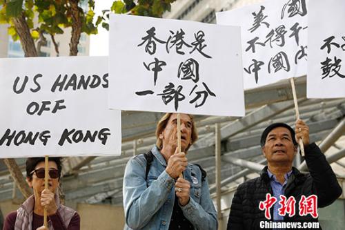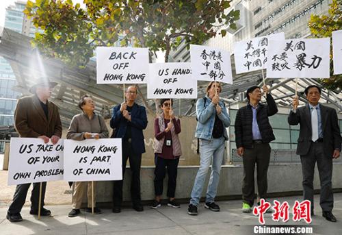 中新社旧金山10月16日电 旧金山湾区多个组织的代表及当地民众16日聚集到旧金山联邦大楼前,手举标语,高喊口号,抗议美国国会众议院于当地时间10月15日通过的所谓“2019年香港人权与民主法案”,并向美国国会众议院议长南希·佩洛西办公室提交了包含100多人签名的请愿书。