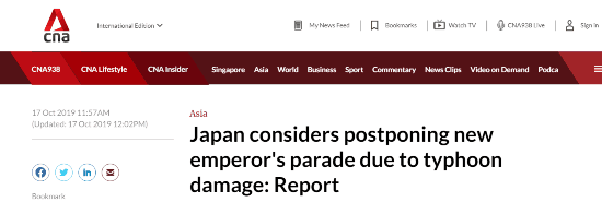 亚洲新闻台(Channel News Asia)17日援引日本NHK电视台消息称,由于台风“海贝思”所造成的损失巨大,日本政府正考虑推迟下周天皇登基后的游行庆祝活动。