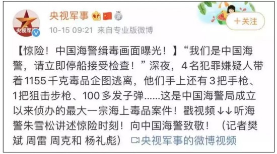 近日央视军事发布的一段中国海警缉毒视频引发热议,相关话题一度冲上热搜。