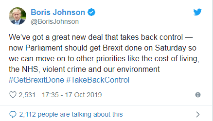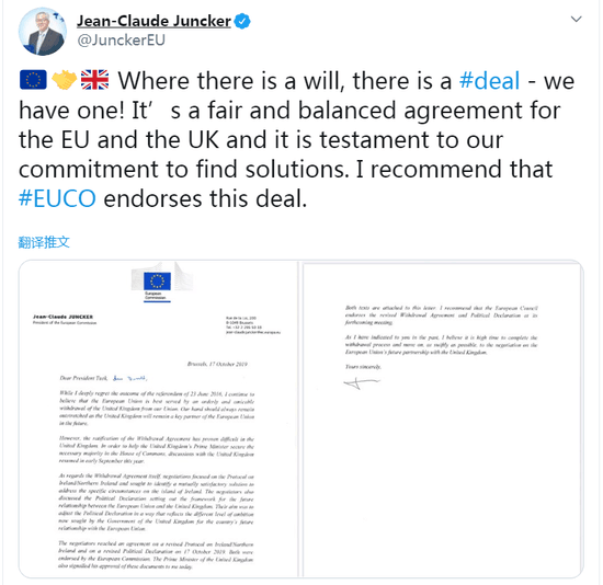 当地时间17号上午,在欧盟峰会即将召开之际,欧盟委员会主席容克与英国首相约翰逊宣布欧盟与英国达成新的脱欧协议。容克在社交网络上表示,这是一份公平且平衡的协议,建议欧盟峰会通过这份协议。