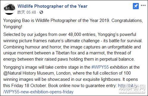 英国野生动物摄影师年赛是由英国BBC《野生动物》杂志与英国自然历史博物馆联合创办的,目的是通过摄影让更多的人关注自然及野生生物保护,被称为国际野生动物摄影界的“奥斯卡”。