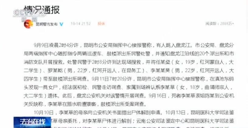 央视记者 刘建辉:针对家属的质疑,网络上的传闻,昆明警方进行了初步调查。10月14日,昆明警方发布了通报,在梳理出这起案件更多细节的同时,也回应了这起案件的部分疑点。