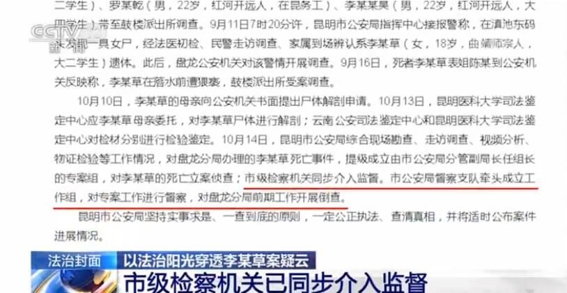 10月14日,昆明市公安局提级成立由市公安局分管副局长任组长的专案组,对李某草的死亡立案侦查;市级检察机关同步介入监督。市公安局督察支队牵头成立工作组,对专案工作进行督察,对盘龙分局前期工作开展倒查。