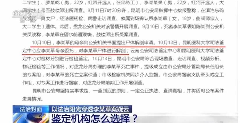 根据10月14日昆明警方发布的情况通报显示,2019年10月10日,李某草的母亲向公安机关书面提出尸体解剖申请。10月13日,昆明医科大学司法鉴定中心应李某草母亲委托,对李某草尸体进行解剖;云南公安司法鉴定中心和昆明医科大学司法鉴定中心对检材分别进行检验鉴定。那么,鉴定机构是怎么选择的呢?