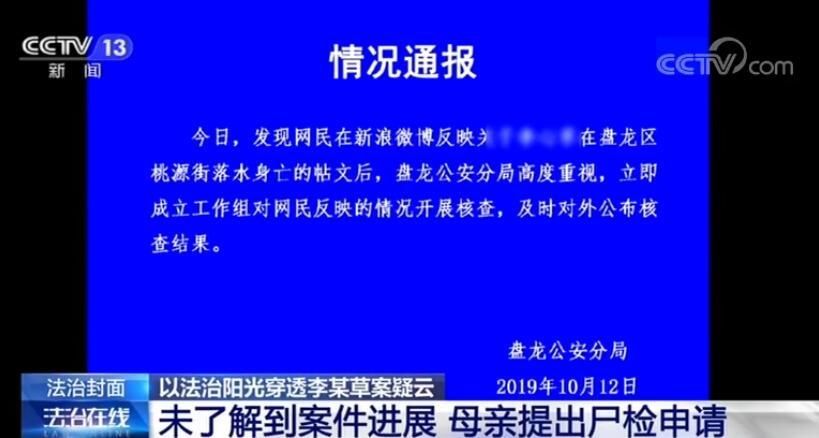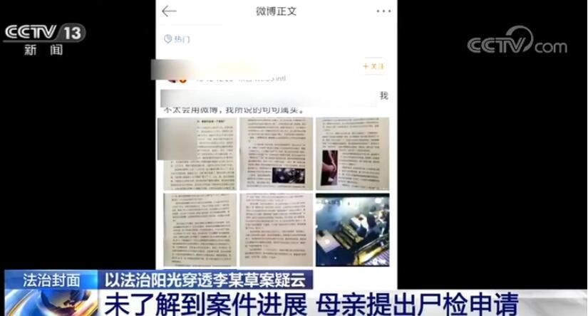 10月10日,李某草的母亲向公安机关提出了尸体解剖的申请;10月12日,李某草母亲将心中的疑问发到了网络上,除了引发舆论的极大关注外,这条微博也引起了当地警方的重视。