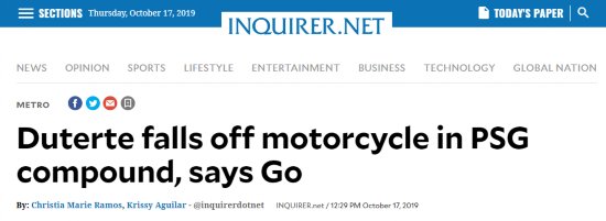 另据《菲律宾每日问询者报》报道,杜特尔特前特别助理、参议员克里斯托弗·邦戈(Christopher “Bong” Go)17日早些时候也向媒体提到,杜特尔特16日晚在马尼拉总统安全小组(PSG)大院内时也从摩托车上摔下来。邦戈还说,总统还抱怨臀部痛,但没有住院。