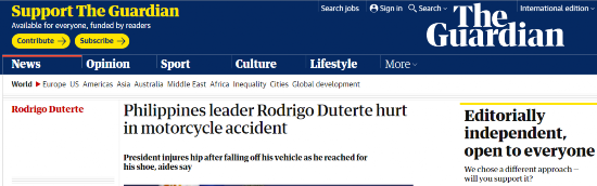 健康问题一直备受外界关注的菲律宾总统杜特尔特16日晚受伤了。据英国《卫报》消息,菲律宾总统发言人帕内洛称,他从摩托车上摔了下来。