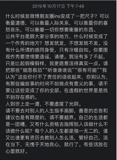 此前,因为韩国女星崔雪莉离世,作为f(x)成员的宋茜并未在社交媒体表态而遭到了恶评。在长文中,宋茜称,“公共平台是跟大家分享的地方,什么时候变成了一个作秀的地方?想发就发,不想发就不发。没有什么所谓的感同身受,冷暖自知。你要围观作秀,要泄愤要造谣,请便。我没有多了不起,只是比起假模假样,我更愿意活得真实一点。”